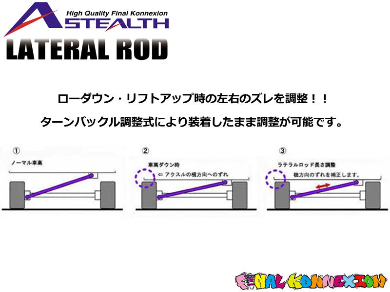 調整可能なラテラルロッドを使用することでローダウン時、ノーマルでは調整しきれない範囲まで調整可能。
